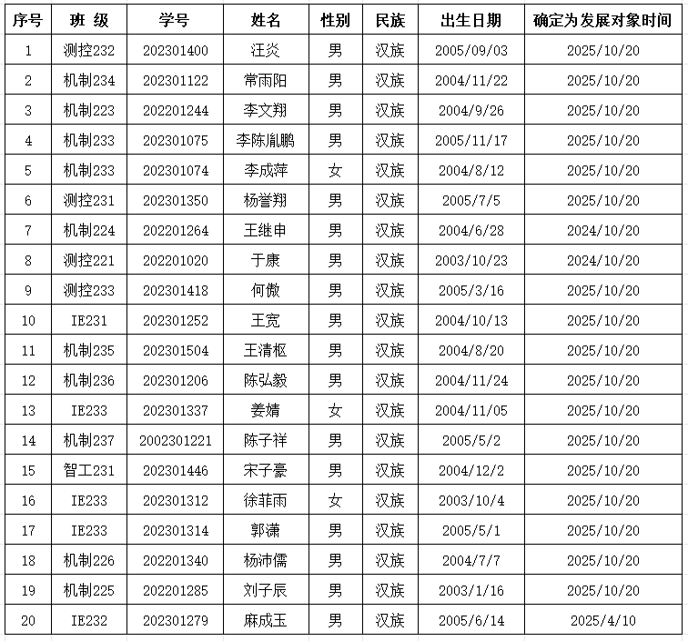 根据《中国共产党发展党员工作细则》(中办发〔2014〕33号)文件精神,按照学校党员发展工作的具体要求,现将我院2025年11月拟发展学生预备党员预审情况予以公示,具体名单如下: